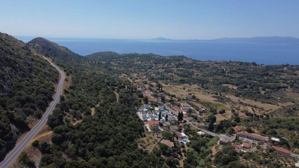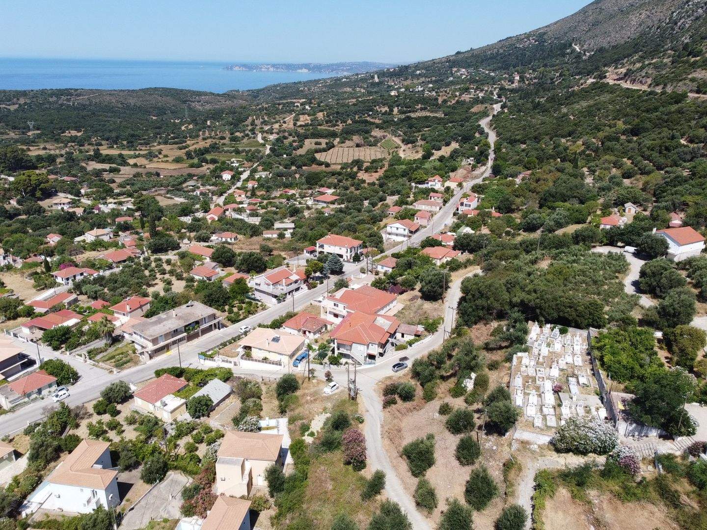 A tranquil hillside village offering distant sea views and rural serenity.